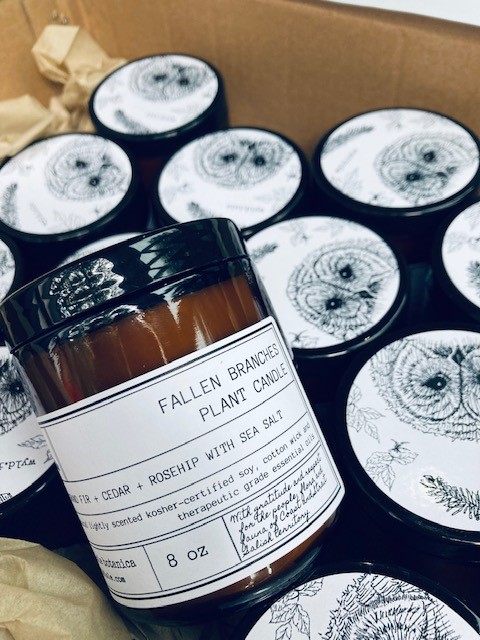 Made with sea salt, kosher-certified soy wax, cotton wick and therapeutic grade essential oils, hand-poured in 8oz amber glass.